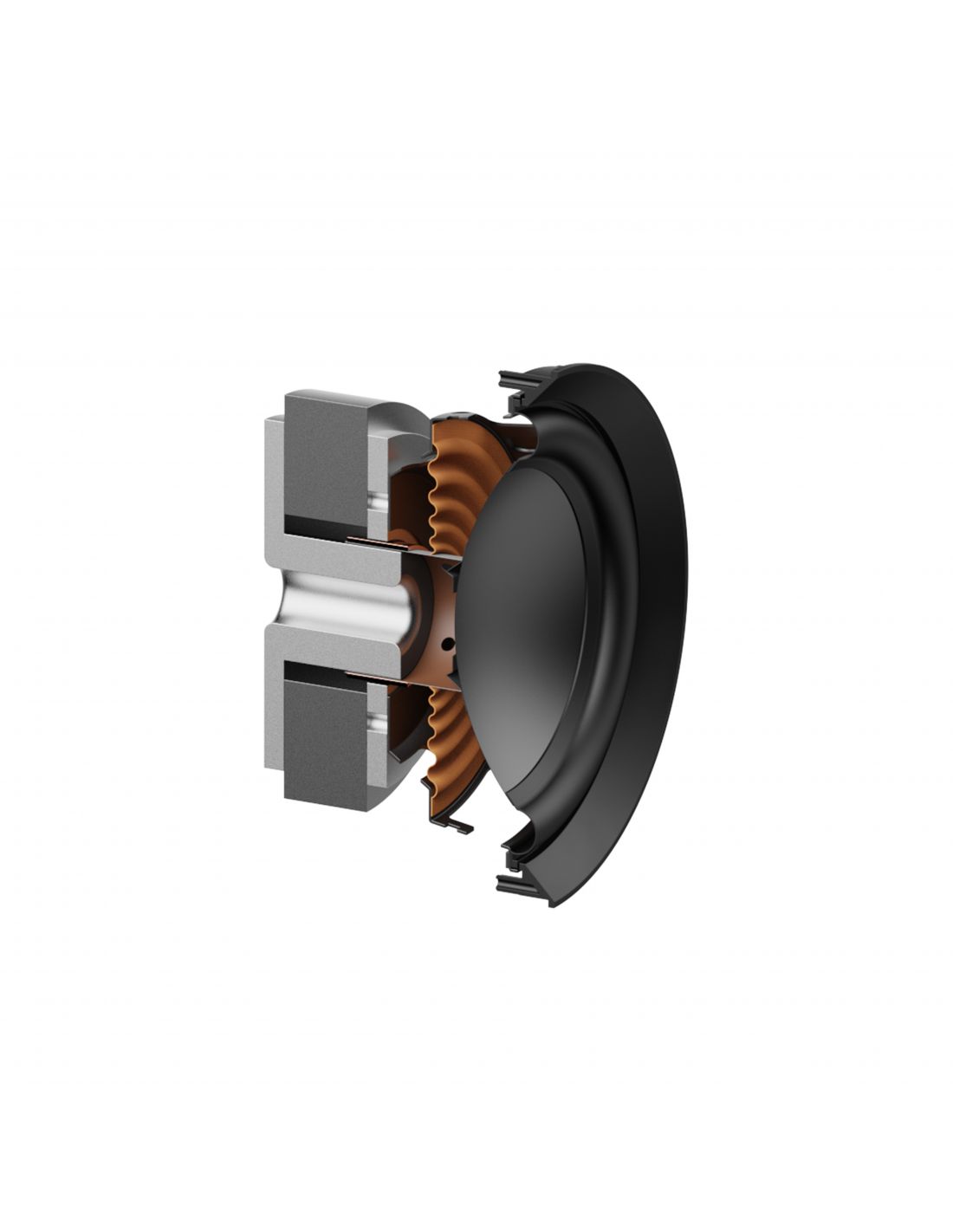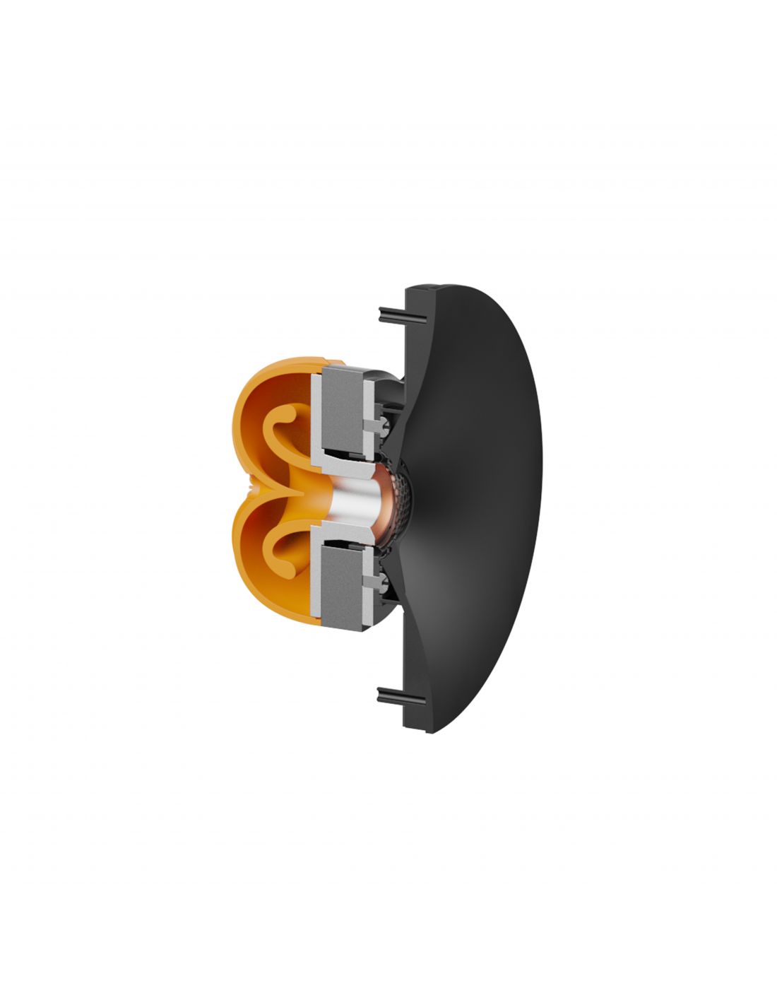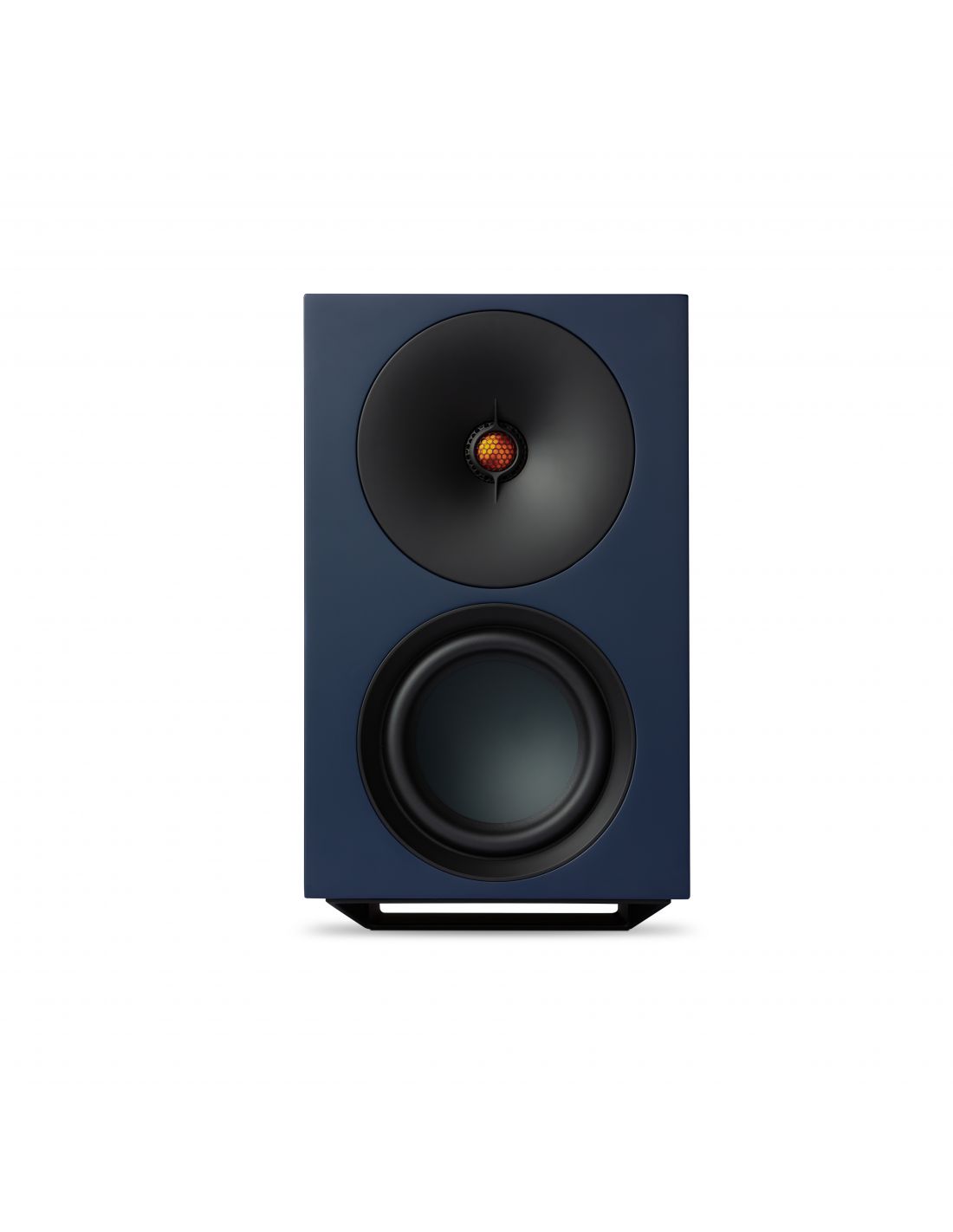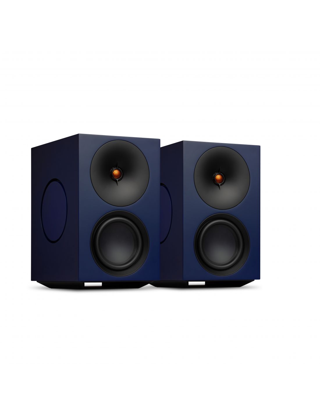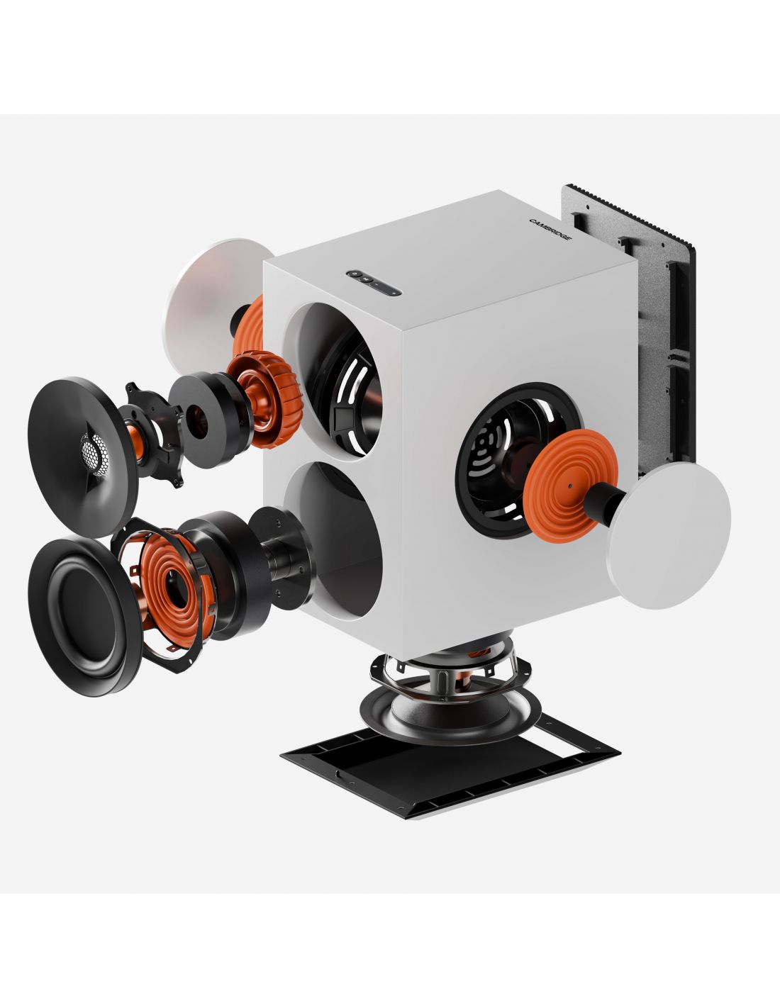 Ce tweeter propriétaire inédit est associé à deux haut-parleurs de 12.7cm - le premier étant orienté vers l'avant, tandis que la deuxième est discrètement intégré dans la base, afin de renforcer les basses fréquences - et deux radiateurs passifs de 15.2cm à annulation de force, placés sur chaque flanc de l'enceinte. Ces derniers sont réglés à une fréquence exceptionnellement basse de 38 Hz, étendant les performances des basses jusqu'à la gamme moyenne de 30 Hz.