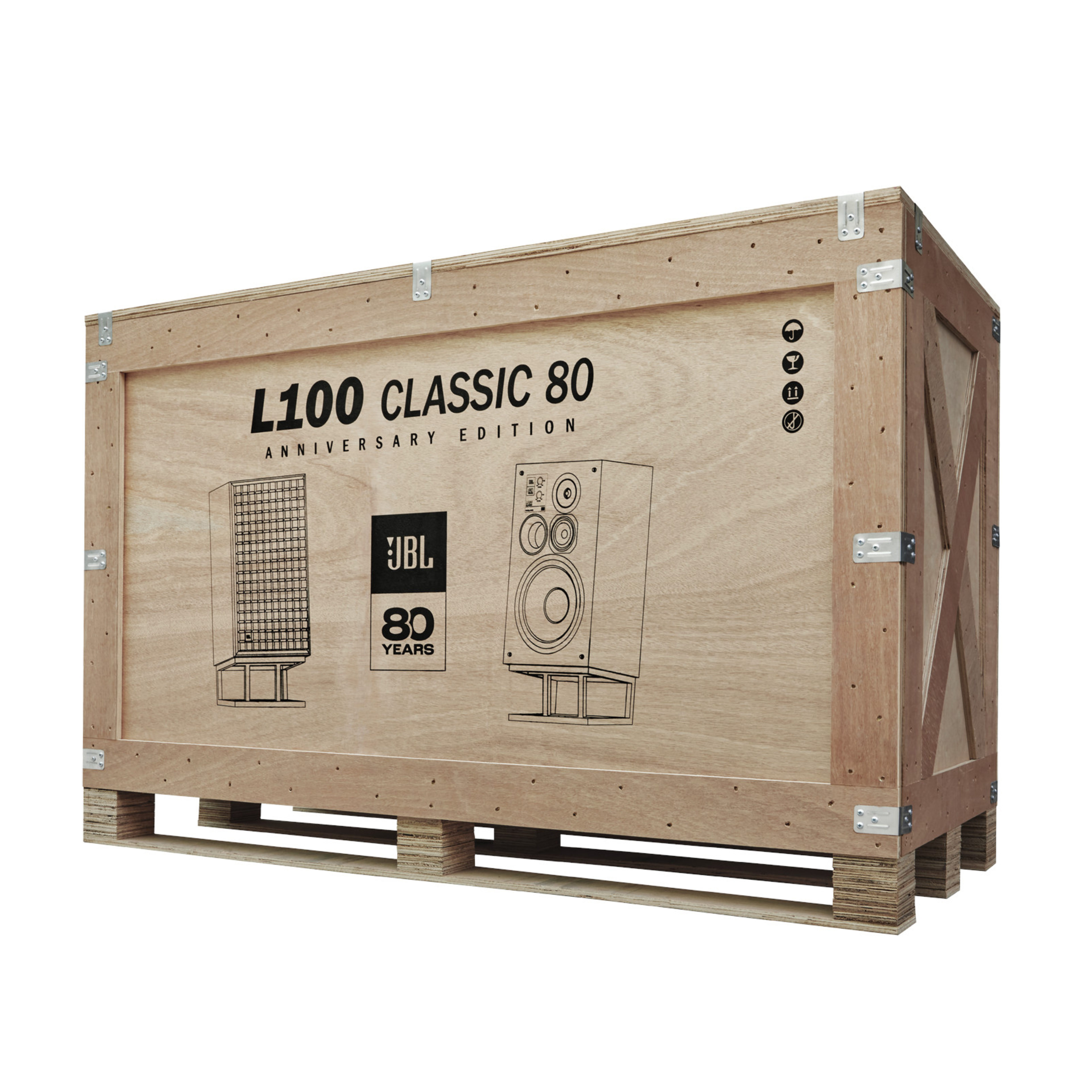 Mais l’enceinte JBL L100 Classic 80 ne se résume pas qu’à son seul physique affriolant, la prestance phonique typée moniteur pro est plus que jamais au rendez-vous. Bien qu’imbibée de nostalgie, cette enceinte est équipée de nouveaux haut-parleurs et d'un filtre optimisé pour offrir des performances inoubliables à la hauteur de son fantastique pédigré. Un tweeter à dôme en titane de 25mm (JT025Ti2-4) - couplé à un guide d'ondes avec une lentille acoustique - jouxte un haut-parleur de médium de 130mm à cône Pure Pulp recouvert de polymère (JM125PC-8). Des basses saisissantes sont fournies par un haut-parleur de graves de 300mm à membrane en Pure Pulp, à cadre moulé et double suspension (JW300SW-8), serti dans un boîtier bass-reflex, doté d’un évent tubulaire frontal qui simplifie considérablement le placement de l’enceinte. L’enceinte JBL L100 Classic 80 permet un bi-câblage via ses doubles borniers plaqués or. Des facultés très séduisantes - très demandées et désormais de série ! – empruntées à l’éphémère Black Edition des modèles L100 et L82 Classic dévoilée en 2023. Les atténuateurs en L des hautes et moyennes fréquences installés sur le panneau avant conservent les caractéristiques classiques du modèle matrice. Les pieds spécifiques JS-150 sont fournis de série avec cette édition 80ème anniversaire pour une inclinaison arrière optimale de l’enceinte. Les enceintes et leurs supports sont livrés dans une caisse en bois spécialement conçue pour l'occasion. La production est limitée à 800 paires dans le monde entier.