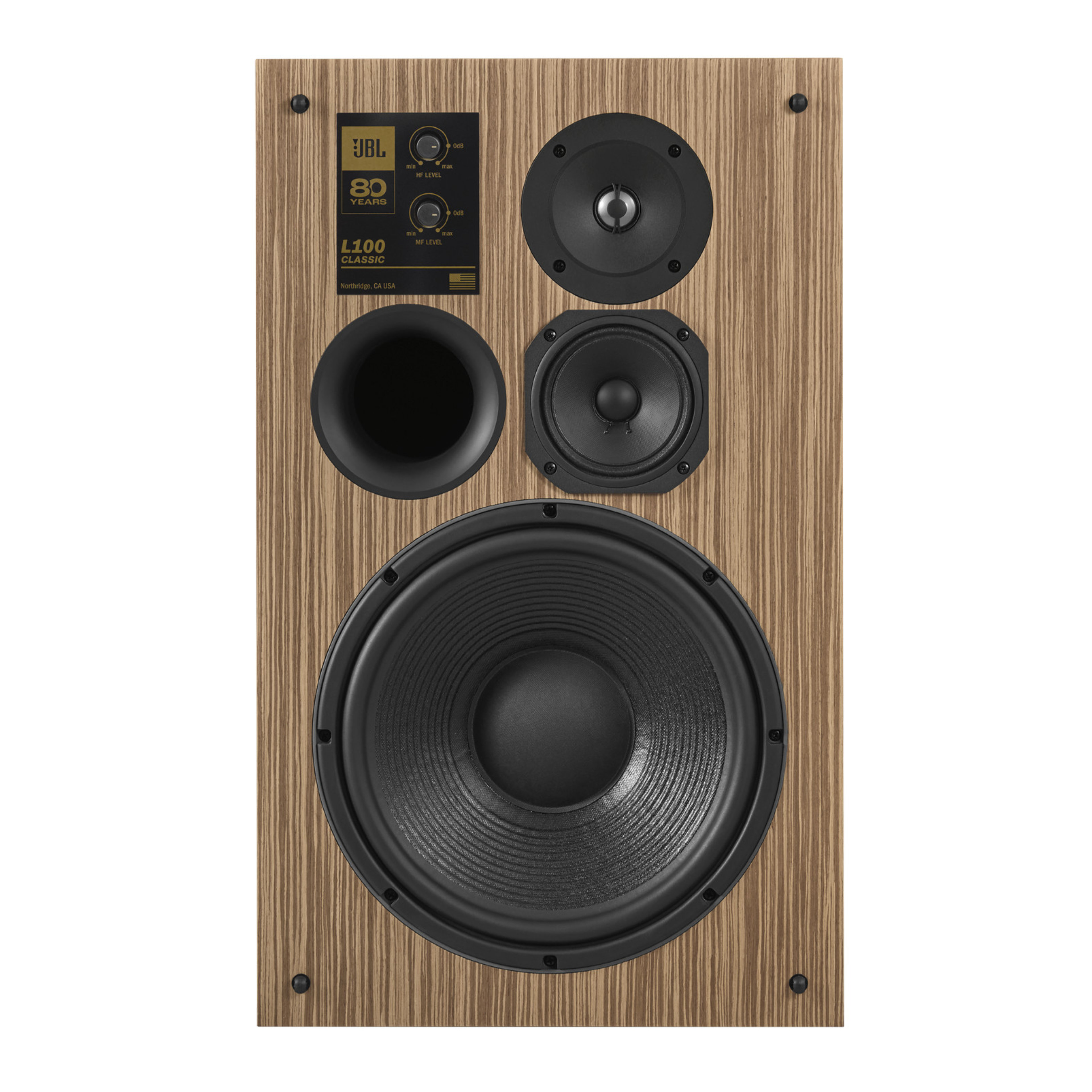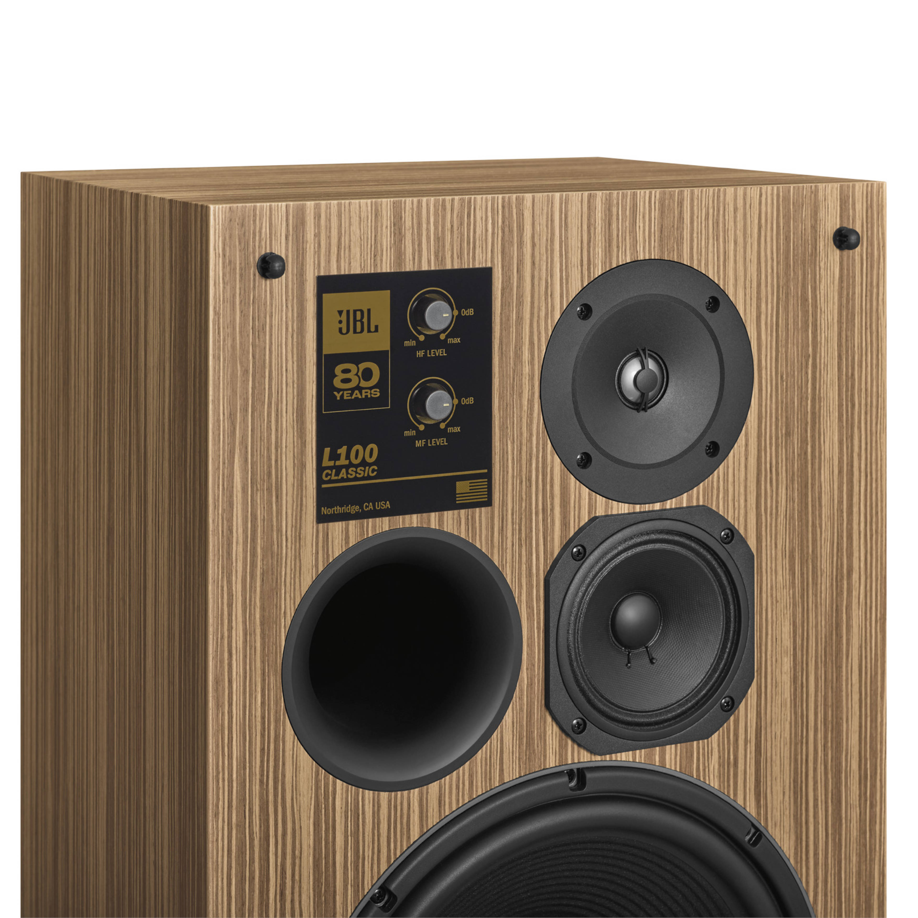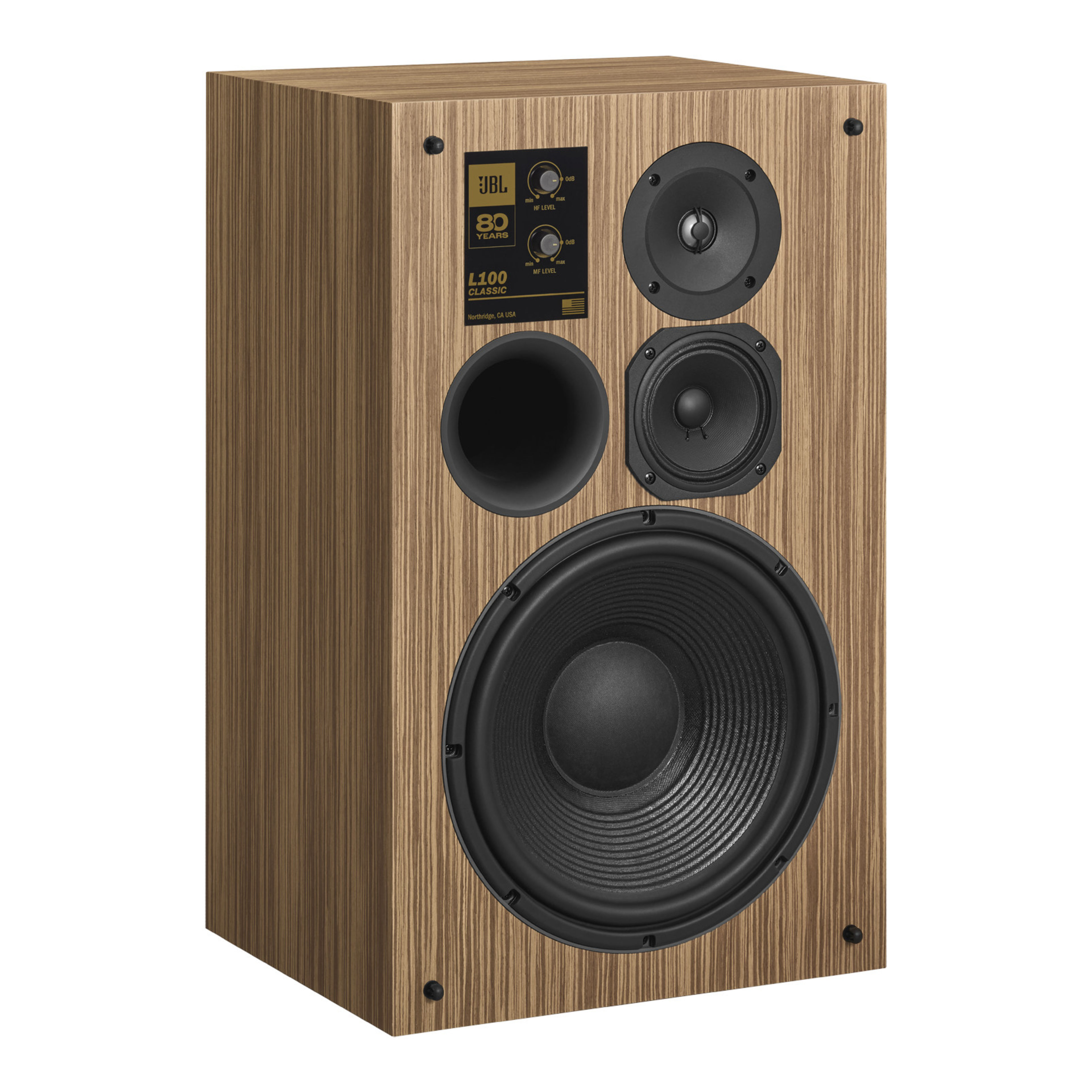 L’enceinte bibliothèque 3 voies JBL L100 Classic fait ostensiblement allégeance au modèle archétypal d’enceinte monitoring domestiquée du même nom, arrivée sur le marché en 1970. Bénéficiant d’un engouement sans précédent, l’enceinte JBL L100 originale gagne rapidement le statut culte, et tel le sismographe des seventies, relaie avec acuité l’embrasement culturel américain de l’époque. Aujourd'hui, cette édition L100 Classic 80, limitée à 800 exemplaires dans le monde, fait office de témoin élégant des 80 ans d'existence de la maison américaine.
