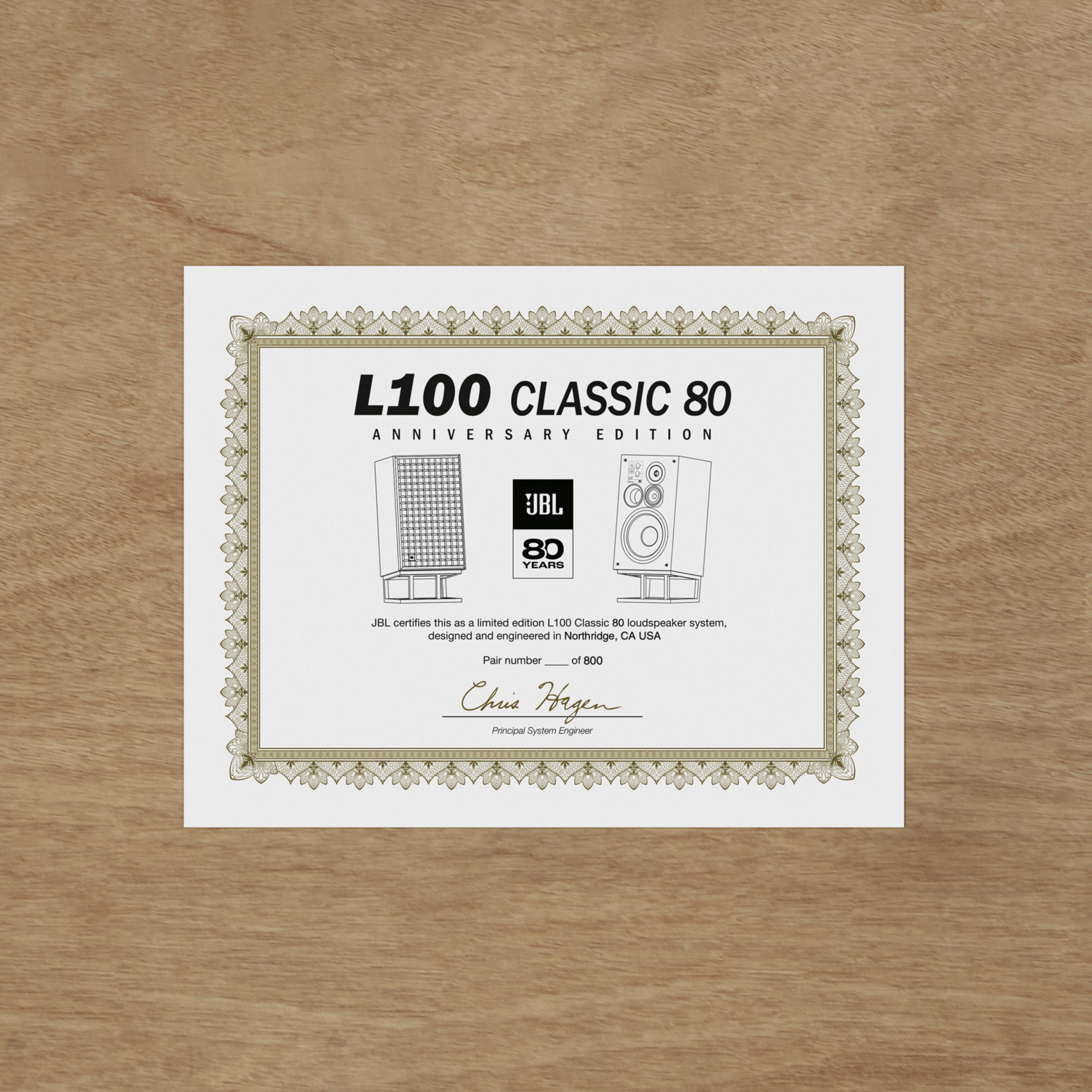 Relecture élégante à la dimension memorabilia indéniable, cette ultime version est le portrait craché du modèle mythique, la maison américaine ayant eu la présence d’esprit de la parcimonie quant aux altérations esthétiques apportées à cette réédition, qui conserve son flair rétro terriblement élégant. La légende JBL hante ses lignes néo vintage, lui assurant ainsi le même charisme nucléaire qui a fait du modèle référence le best-seller absolu de la marque. L’enceinte L100 Classic 80 revêt donc un volumineux coffre en placage chêne et l’emblématique grille en mousse Quadrex, déclinée dans un délicat marron, estampillée d'un logo JBL noir et or, et sertie dans un cadre en bois satiné noir. Enfin, des badges anniversaire sont apposés à l'avant et à l'arrière de l'enceinte, notamment une plaque numérotée ornée du numéro de série de la paire parmi la production totale de ce modèle ultra exclusif.