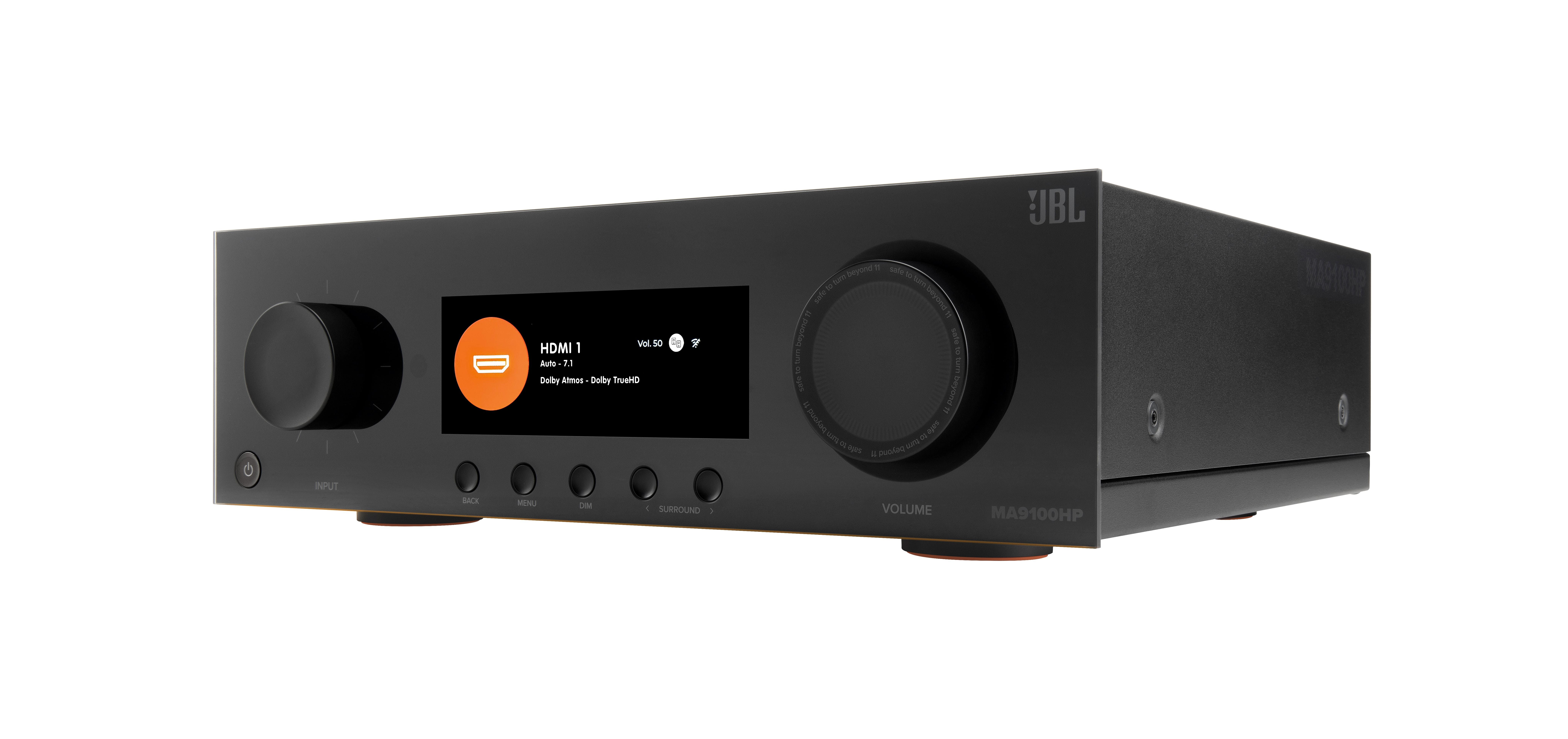 Primauté acoustique de la gamme MA, l’amplificateur 9.2 JBL M9100HD se distingue significativement de part la présence d’un sublime écran LED couleur sur sa façade, affichant pochettes d’albums et autres logos des stations de radio en écoute. Autre particularité notable : son panneau avant est souligné par un bandeau LED coloré, qui pourra adopter la couleur fétiche de son utilisateur - ou s’assortir à sa console de jeu par exemple - via l’application JBL Premium.