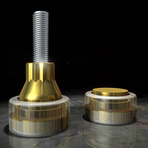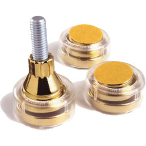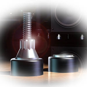 Il se lance alors bille en tête dans un long prologue, peuplé d’études de marché, de laborieux tests, de multiples essais matériaux, d’interminables conceptions de prototypes… jusqu’à trouver la formule magique : un support simple, apte à fonctionner en synergie avec la majorité des produits du marché, offrant évidemment des performances de pointe, sans dommages collatéraux sur le capital séduction des planchers les plus délicats. Cette petite révolution auréolée d’un brevet, c’est le SuperSpike, bijou de conception scientifique audiophile à la morphologie alambiquée et sur-étudiée capable de supporter jusqu’à 400kg sans altération de sa pointe. Lors de son élaboration consciencieuse, de nombreux matériaux ont été mis à l’épreuve. Le zinc était le plus efficace pour réduire la résonance mais n’était pas assez solide. Le bilan fut exactement inverse pour l’acier. La pointe en laiton elle, raisonnait moins que celle en acier mais ne supportait qu’une petite cinquantaine de kilos avant déformation.