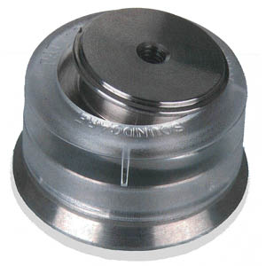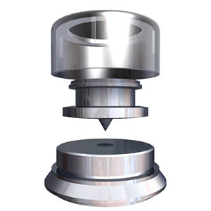Après moultes ébauches, l'acier s'est tout de même avéré être la meilleure substance pour la pointe. Le zinc est pressé autour de celle-ci pour réduire la résonance. Le disque de protection est composé d’un insert en acier doux entouré de zinc, doté d’un trou et d’un fond plat pour recevoir la pointe. L'acier doux a été utilisé dans la base car la pointe devrait être la partie la plus solide de l'assemblage. En plaçant l'extrémité arrondie de 0,5 mm de la pointe sur le fond plat de l'insert, on obtient un point de contact très petit avec une très bonne résistance.